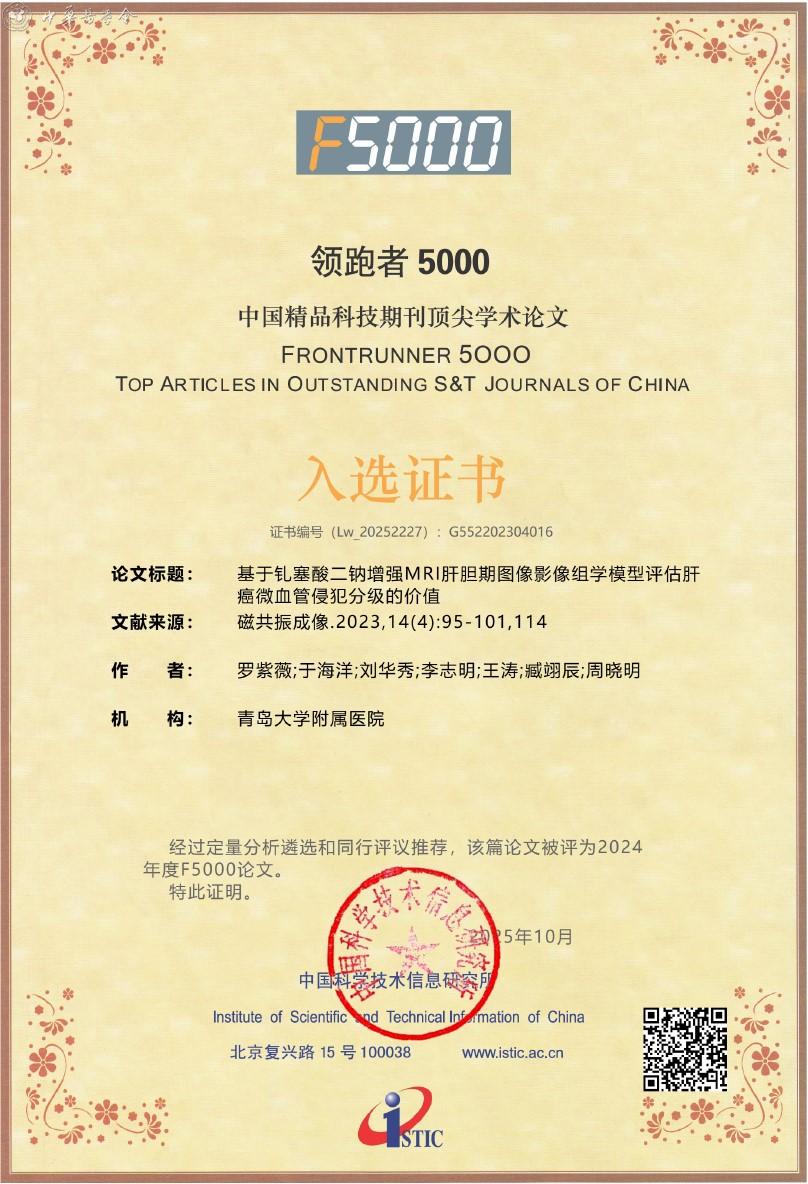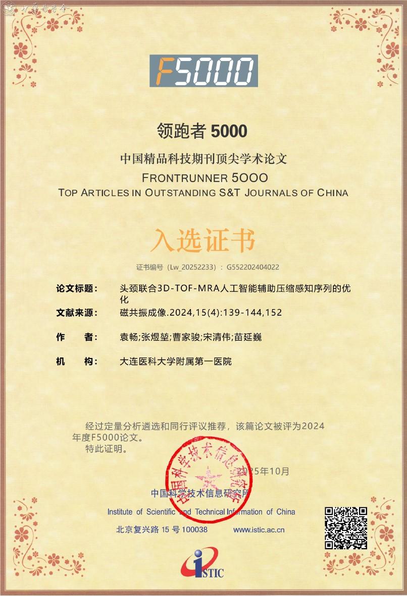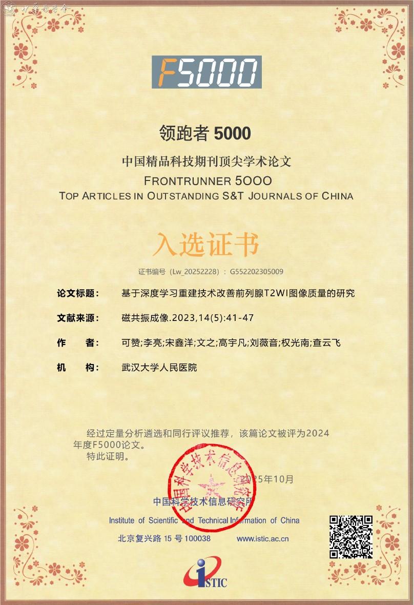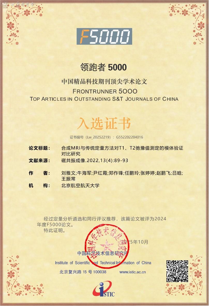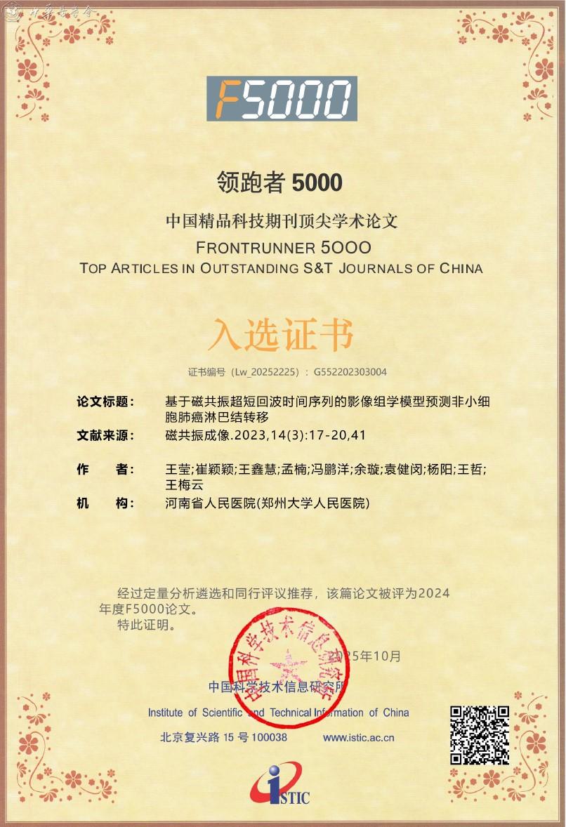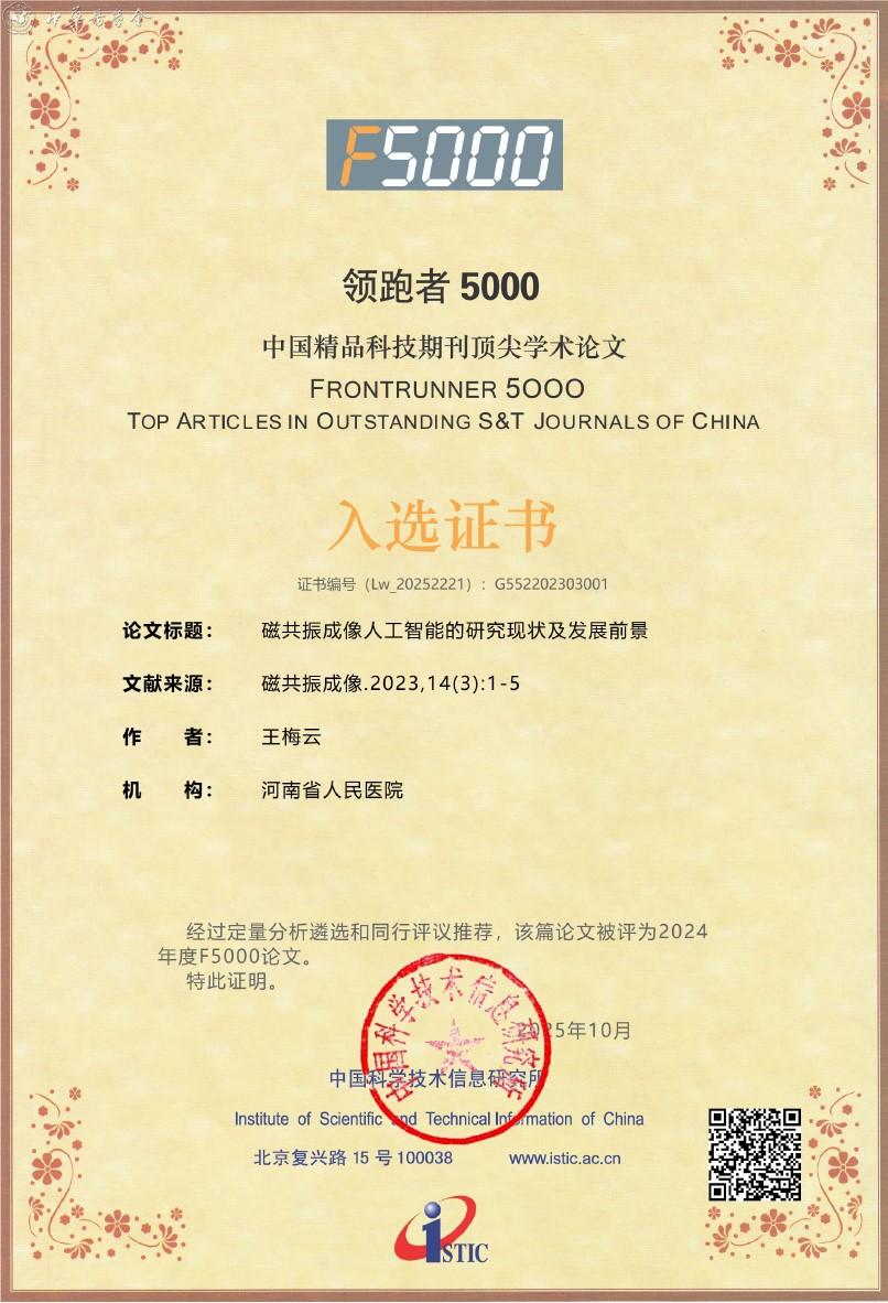 附:《磁共振成像》杂志入选2025年度精品期刊顶尖论文平台——领跑者5000(F5000)证书