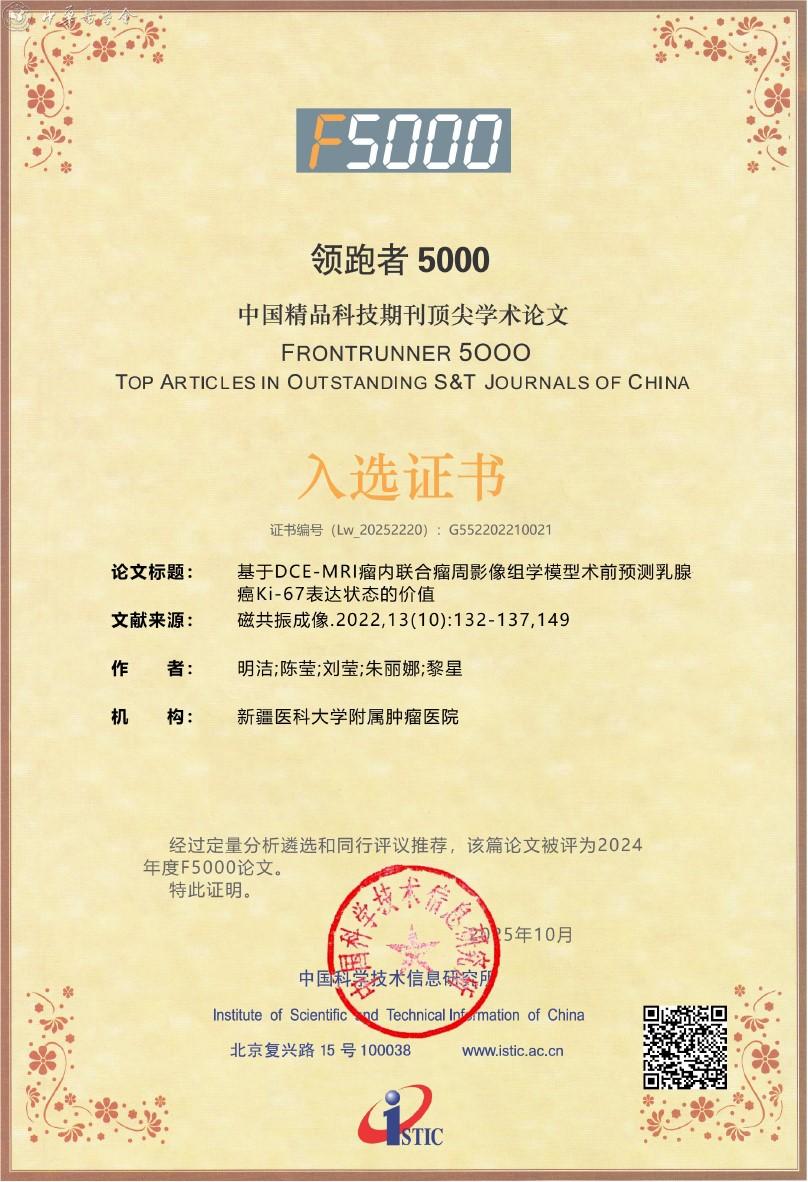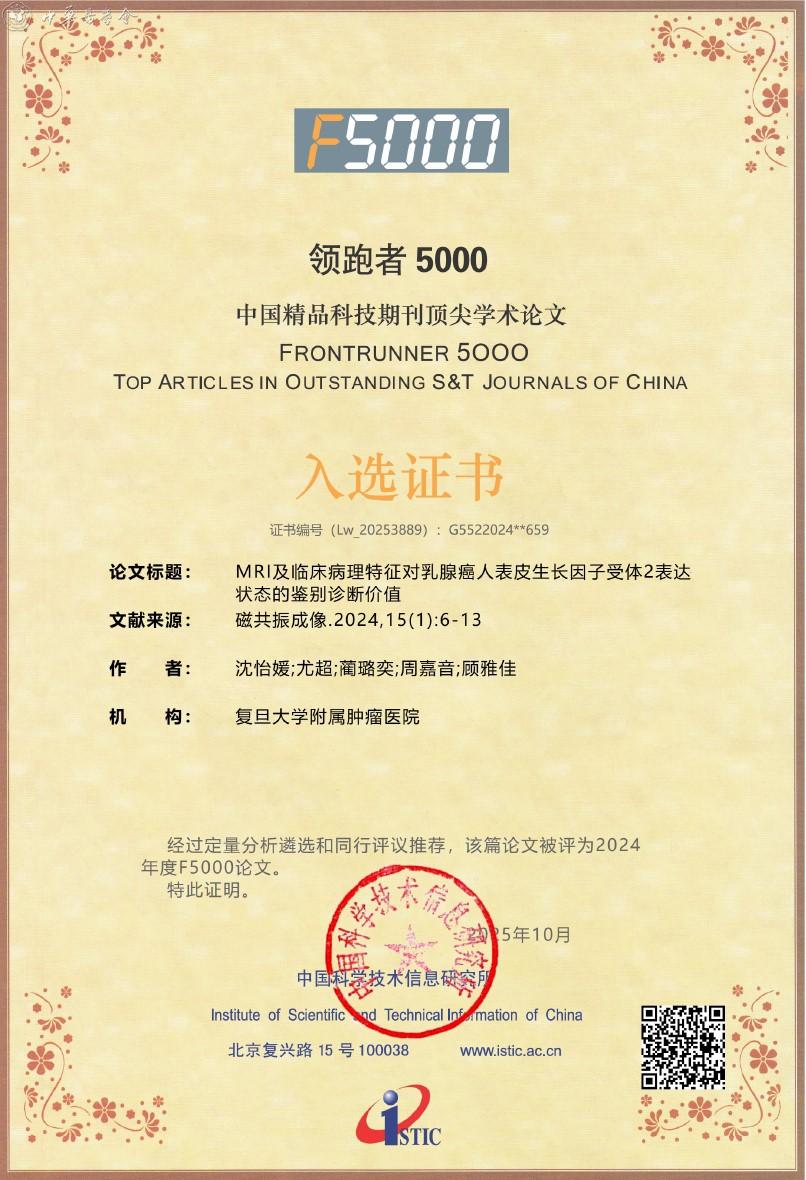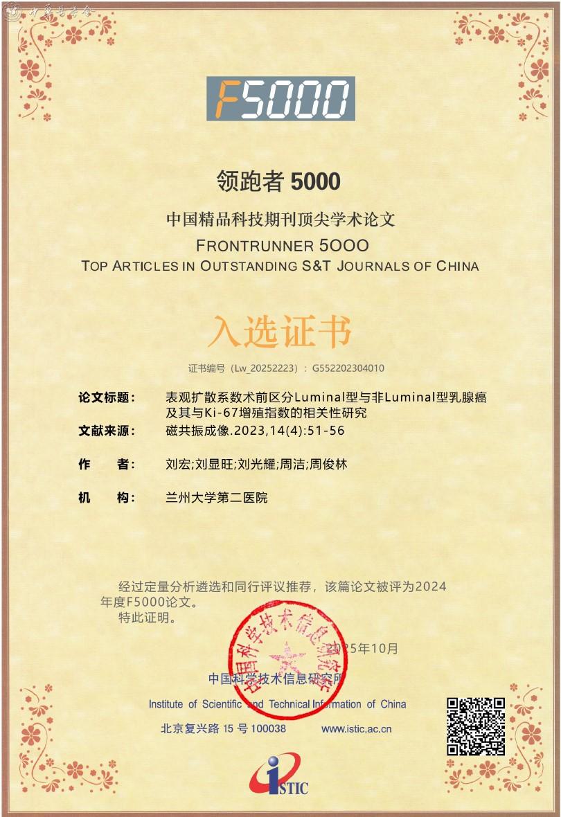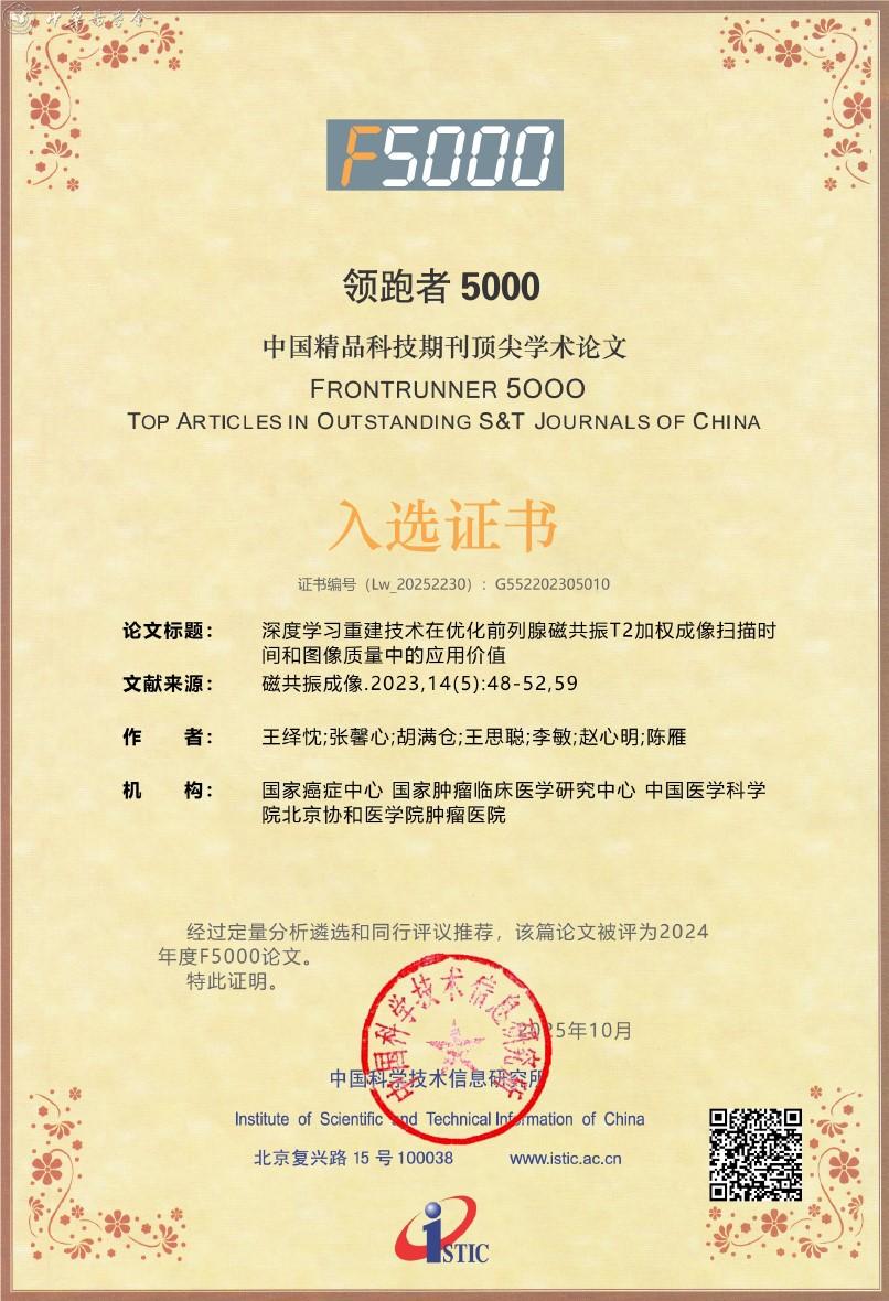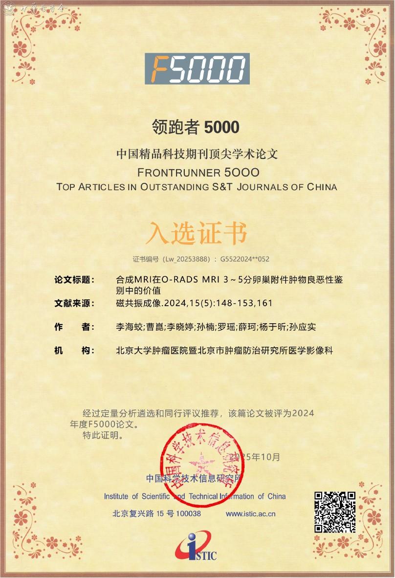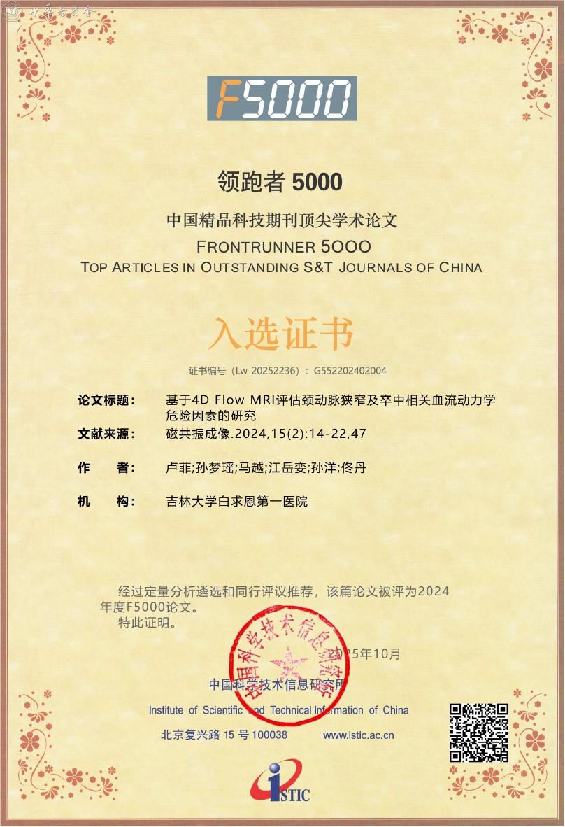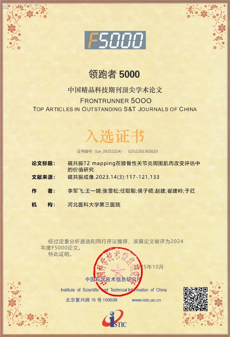 附:《磁共振成像》杂志入选2025年度精品期刊顶尖论文平台——领跑者5000(F5000)证书